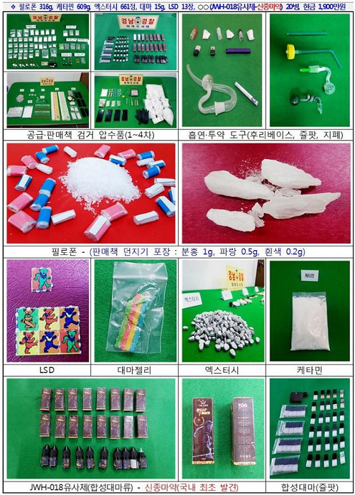 À̵éÀº Áö³­ÇØ 4¿ùºÎÅÍ 12¿ù±îÁö ÅÚ·¹±×·¥ µî SNS¸¦ ÀÌ¿ëÇØ ÇØ¿Ü¿¡¼­ ¹Ð¹ÝÀÔÇÑ ÇÊ·ÎÆù 640g°ú ¿¢½ºÅͽà 6,364Á¤, ÄÉŸ¹Î 3,560g, LSD 39Àå, ÇÕ¼º´ë¸¶ 280§¢, ´ë¸¶ 90g µî ÃÑ 49¾ï¿ø »ó´çÀÇ ¸¶¾àÀ» À¯Åë½ÃŲ ÇøÀǸ¦ ¹Þ°í ÀÖ´Ù.