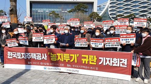 ³ó¹ÎµéÀº "3±â ½Åµµ½Ã LH Á÷¿øµéÀÌ Åõ±âÇÑ ¶¥ Áß 98.6%°¡ ³óÁö¶ó´Â »ç½Ç¿¡ ºÐ³ëÇÑ´Ù"¸ç "°¡Àå ¸¸¸¸ÇÑ Åõ±â´ë»ó Áß Çϳª°¡ ³óÁö¶ó´Â Á¡¿¡ ¸Á¿¬ÀÚ½ÇÇÒ »ÓÀÌ¶ó¡±°í ¸ñûÀ» ³ô¿´½À´Ï´Ù.