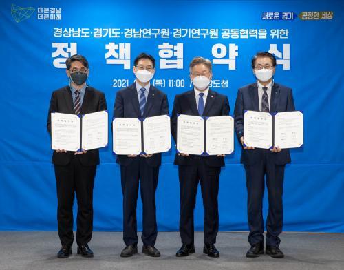 ÀÌÀç¸í °æ±âµµÁö»ç¿Í ±è°æ¼ö °æ³²µµÁö»ç, ÀÌÇÑÁÖ °æ±â¿¬±¸¿øÀå, È«Àç¿ì °æ³²¿¬±¸¿øÀåÀº 17ÀÏ °æ³²µµÃ»¿¡¼ µÎ Áö¿ªÀÇ °øµ¿ ¹ßÀüÀ» À§ÇÑ ¾÷¹«Çù¾à¿¡ ¼¸íÇß´Ù. À̹ø Çù¾àÀº °æ±âµµÀÇ Á¦¾ÈÀ» °æ³²µµ°¡ ¹Þ¾ÆµéÀÌ¸é¼ ¼º»çµÆ´Ù.