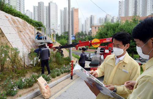 À̳¯ Á¡°ËÀº Áö³ 7¿ù µ¿Àå Á¤·ÊȸÀÇ¿¡¼ ³íÀÇµÈ »çÇ× Áß ¼Û»ê3µ¿¿¡¼ °ÇÀÇÇÑ ÃÊ·Ï´©¸®±Ù¸°°ø¿ø ³» °æ»ç¸é Á¤ºñ ´ë»ó ÇöÀåÀ» Á÷Á¢ È®ÀÎÇϰíÀÚ ¸¶·ÃµÆ´Ù. Ȳ¹ü¼ø ºÎ½ÃÀåÀº ÇöÀåÀ» Á÷Á¢ µÑ·¯º¸°í Àα٠ÁֹεéÀÇ ÀǰßÀ» ûÃëÇÏ´Â ÇÑÆí, ÇÔ²² Âü¼®ÇÑ ´ã´ç ºÎ¼Àåµé°ú ÇØ°á ¹æ¾ÈÀ» ÀçÂ÷ ³íÀÇÇß´Ù.