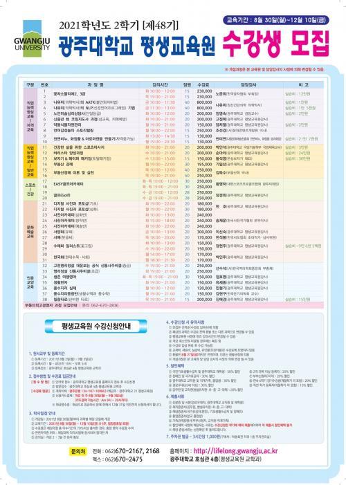 ±âŸ ÀÚ¼¼ÇÑ »çÇ×Àº ±¤ÁÖ´ë Æò»ý±³À°¿ø ȨÆäÀÌÁö(https://lifelong.gwangju.ac.kr/) ¶Ç´Â ÀüÈ(062-670-2167~8)·Î ¹®ÀÇÇÏ¸é ¾È³»¹ÞÀ» ¼ö ÀÖ´Ù.