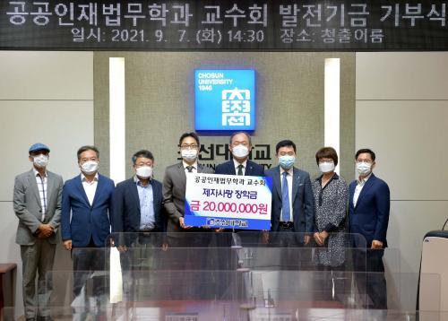 Áö³ 7ÀÏ ¿ÀÈÄ 2½Ã 30ºÐ Á¶¼±´ëÇб³ º»°ü 2Ãþ ûÃâ¾î·ë½Ç¿¡¼ ¿¸° ±âºÎ½ÄÀº Àü¹®¹ýÁ¶Àΰú »çȸ°¢°èÀÇ °øÁ÷ÀÚ ¾ç¼ºÀ» À§ÇØ °ø°øÀÎÀç¹ý¹«Çаú ±³¼öȸ°¡ 2000¸¸¿øÀÇ ÀåÇбÝÀ» Á¶¼º, ±âºÎ½ÄÀ» ÁøÇàÇß´Ù.