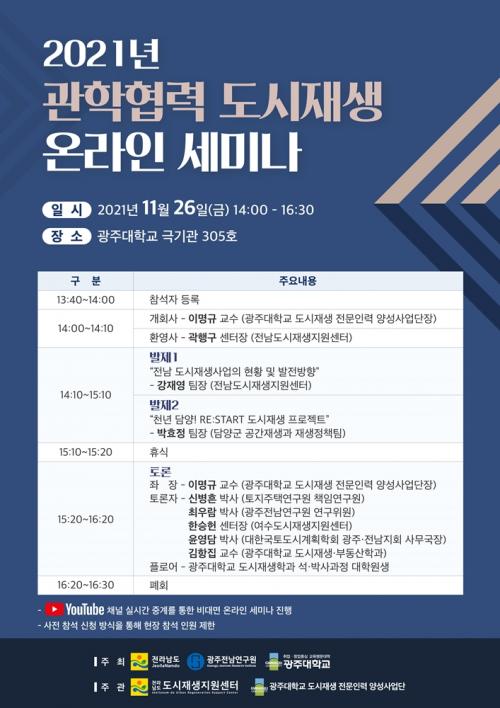 À¯Æ©ºê ä³ÎÀ» ÅëÇØ ½Ç½Ã°£ Áß°èµÇ´Â À̹ø ¼¼¹Ì³ª´Â ¡®µµ½ÃÀç»ý Àü¹®Àη ¾ç¼º °ÅÁ¡´ëÇС¯ÀÎ ±¤ÁÖ´ë¿Í ±¤ÁÖÀü³²¿¬±¸¿øÀÌ ¼ÕÀâ°í Àü³²Áö¿ªÀÇ µµ½ÃÀç»ý »ç¾÷¿¡ ´ëÇÑ ¹ßÀü ¹æÇâ µîÀ» ¸ð»öÇϱâ À§ÇØ ¸¶·ÃµÆ´Ù.
