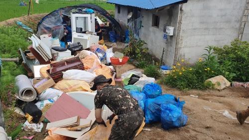 61¿©´Ü 108±âº¸´ë ¼Ò¼Ó À庴 16¸íÀÇ ´ë¹ÎÁö¿ø ÇùÁ¶¸¦ ¹Þ¾Æ ÁøÇàµÈ À̳¯ º¹±¸ÀÛ¾÷Àº Áý¾È ³» Åä»ç¸¦ Ä¡¿ì°í ´ëÇüÆó±â¹°À» ¿Å±â´Â µî ÇÇÇØ º¹±¸¸¦ À§ÇØ ÃÖ¼±À» ´ÙÇß´Ù. ¶ÇÇÑ ¸é»ç¹«¼Ò¿¡¼´Â ´ëÇüÆó±â¹°À» ¹«»ó¼ö°Å Á¶Ä¡ÇÏ°í °ü³» °¡Àü¾÷ü¿¡¼´Â Æó°¡ÀüÁ¦Ç° ¹«»ó¼ö°ÅÇÏ¸ç µµ¿òÀÇ ¼Õ±æÀ» º¸ÅÉ´Ù.