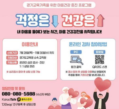 µµ±³À°Ã»Àº ¿ÃÇØ °æ±âµµ±³À°Ã» ¼Ò¼Ó ±³Á÷¿ø 17¸¸¿© ¸íÀ» ´ë»óÀ¸·Î Èñ¸ÁÀÚ¿¡ ÇÑ ÇØ ¿Â¶óÀÎ ½É¸® °Ë»ç¸¦ ÁøÇàÇÏ°í ±× °á°ú¿¡ µû¶ó Àü¹®°¡ »ó´ãÀ» °³Àκ°·Î ½ÅÃ»ÇØ ÃÖ´ë 8ȸ±îÁö ¹«·á·Î ¹ÞÀ» ¼ö ÀÖµµ·Ï ¸¶·ÃÇß´Ù.