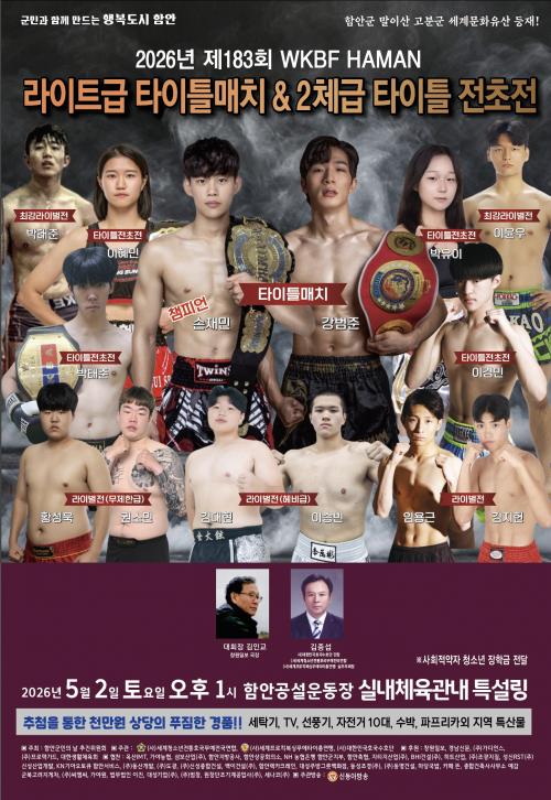 [½Åµ¿¾Æ¹æ¼ÛÇÔ¾È=À̽ŵ¿±âÀÚ]¿À´Â 2026³â ÇԾȱº¹ÎÀdz¯ 4¿ù27ÀÏ Åä¿äÀÏ ¿ÀÈÄ1½Ã, ÇÔ¾È °ø¼³¿îµ¿Àå ½Ç³»Ã¼À°°ü³» Ư¼³¸µ¿¡¼­ Á¦183ȸ WKBF HAMAN ¶óÀÌÆ®±Þ ŸÀÌÆ²¸ÅÄ¡ &2ü±Þ ŸÀÌÆ² ÀüÃÊÀü ½ÃÀÛÇÑ´Ù.